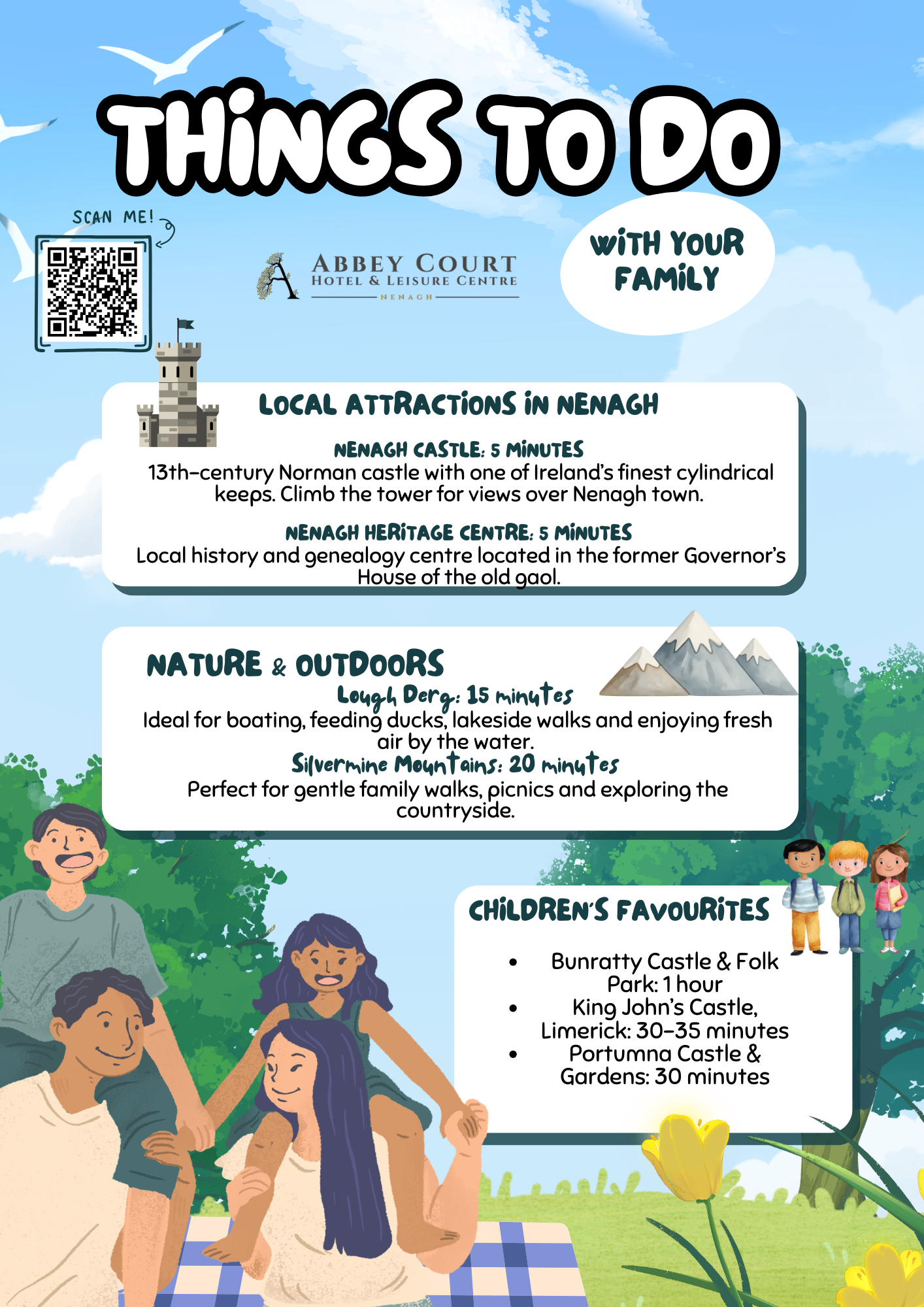 Your family will fall in love with the array of local attractions and family activities Tipperary has to offer. From exciting adventures and water fun at Aqua Splash, walking tours in the local area and a chance to learn the history of the amazing Nenagh Castle and the Rock of Cashel, there is something for everyone to enjoy during your getaway to Nenagh. Discover the very best of Ireland's Hidden Heartlands and uncover unexplored tracks and trails, cultural kicks, Irish heritage, exciting waterside towns, and picturesque rural villages.